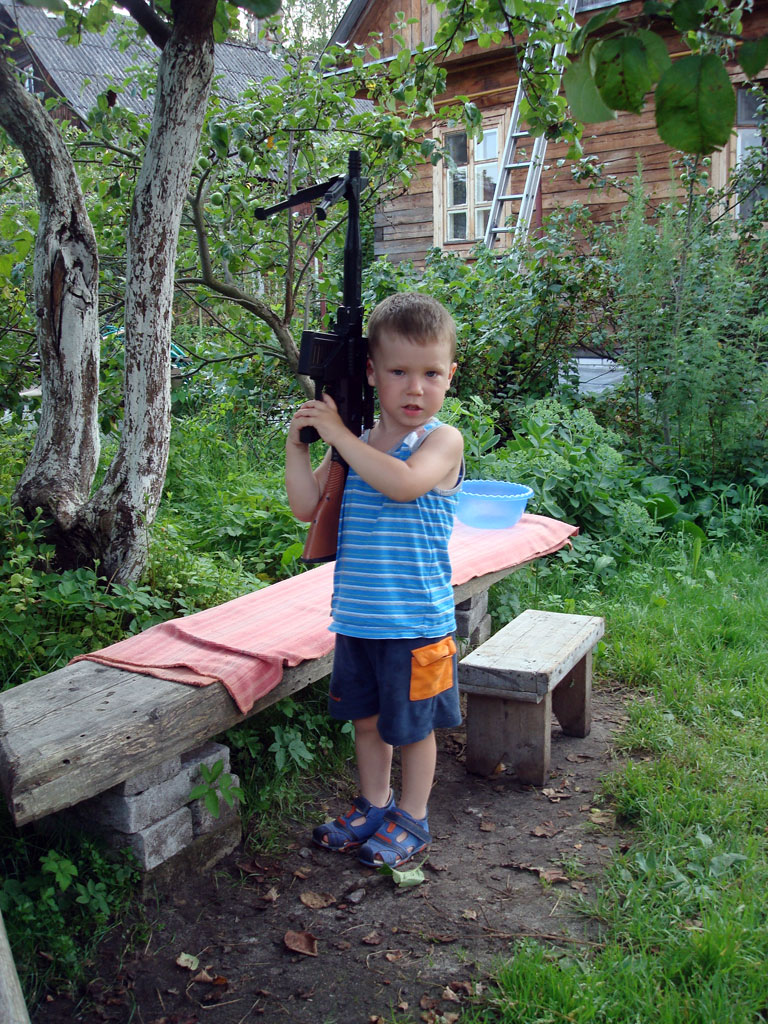 Jul. 19th, 2010 10:44 amВчера Сергею Васильевичу, наследнику моему ненаглядному, стукнуло три годика. И он собрался в армию :) Мамка, как водится, не пускает, но автомат он уже нашел...