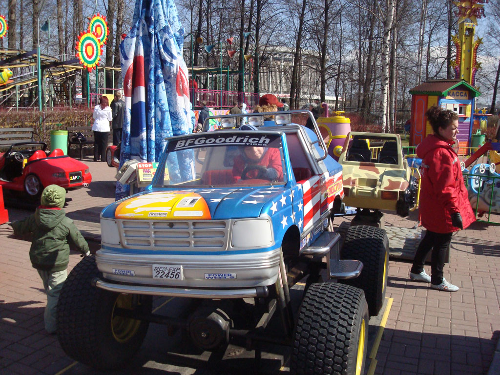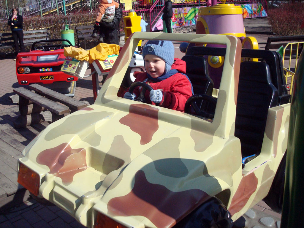 Ну вот, с покормить разобрались, пора и покататься. Катались на гусенице, на паровозике, на праворульной машине: