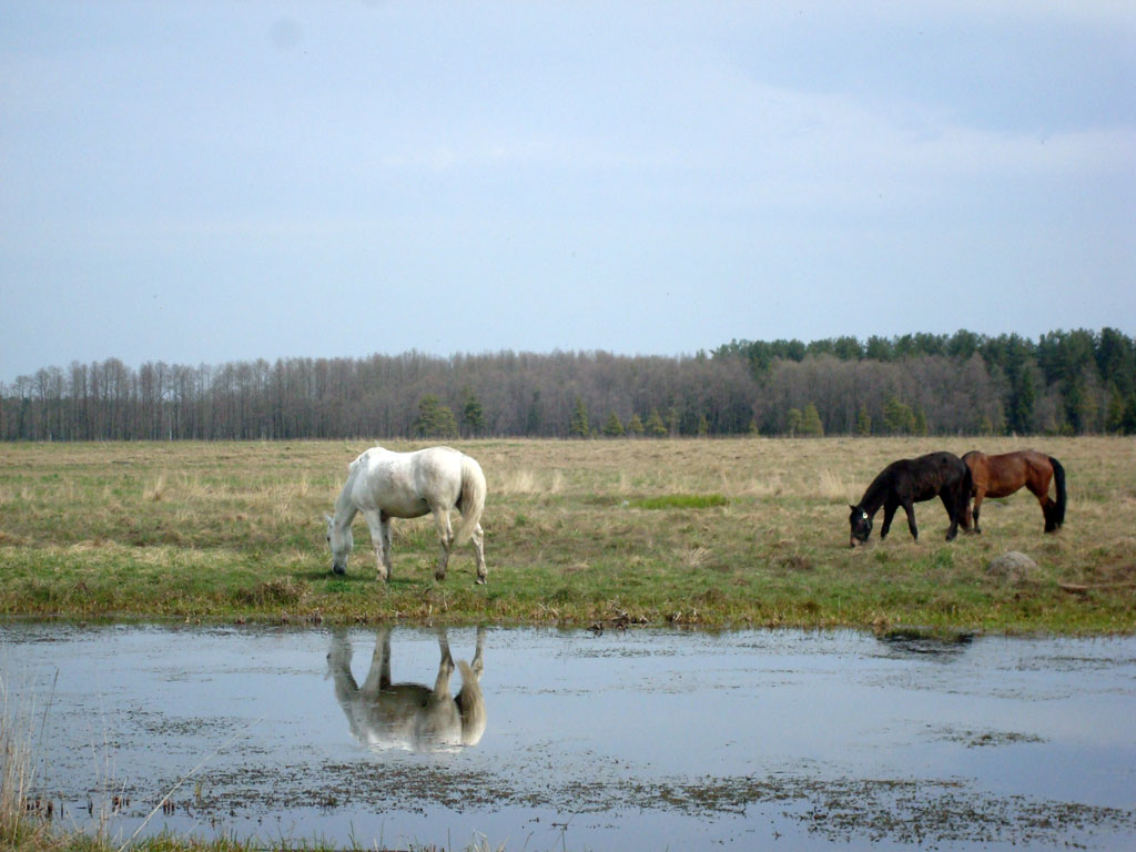 У ручья бегает всякая животина, галка там и трясогузка, собачки соседские. Вороны еще и козы. У пруда, из которого ручей течет, лошадки травку жрут и ее же удобряют: