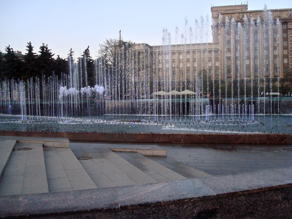 Там как сделано - часть сопел управляется как-то, причем группками. И вот, значится, музыка "бдыщь"! - вода залпом вверх! Музыка "турли-турли" - уже из других трубок, не столь мощные струйки стоят. Музыка "пым-пым-пым" - в разных местах небольшие залпы. Это надо видеть. Впрочем, у меня ж запись есть, только музыки не слышно - забивает ее шум фонтана за спиной. Того самого "малыша".